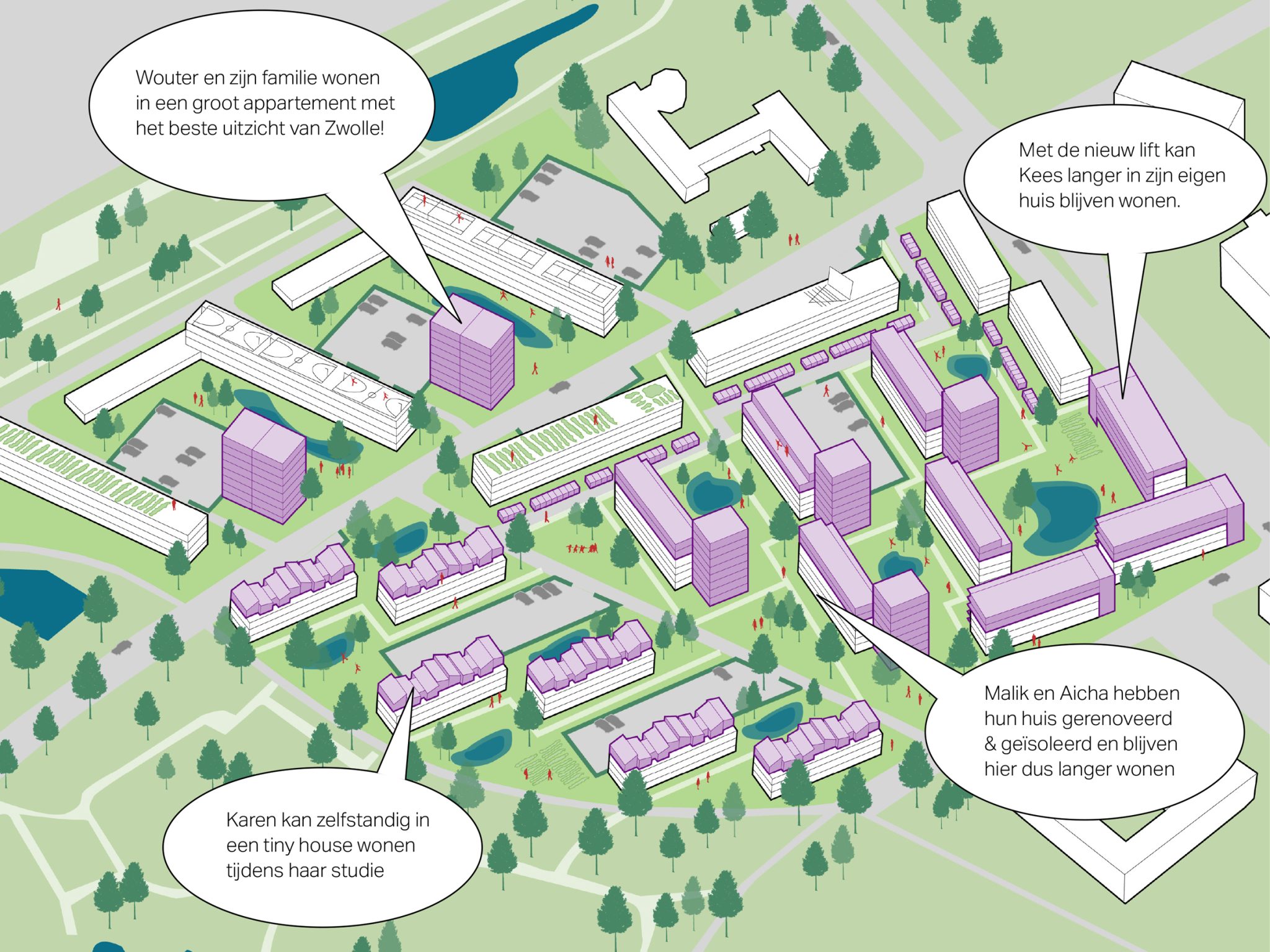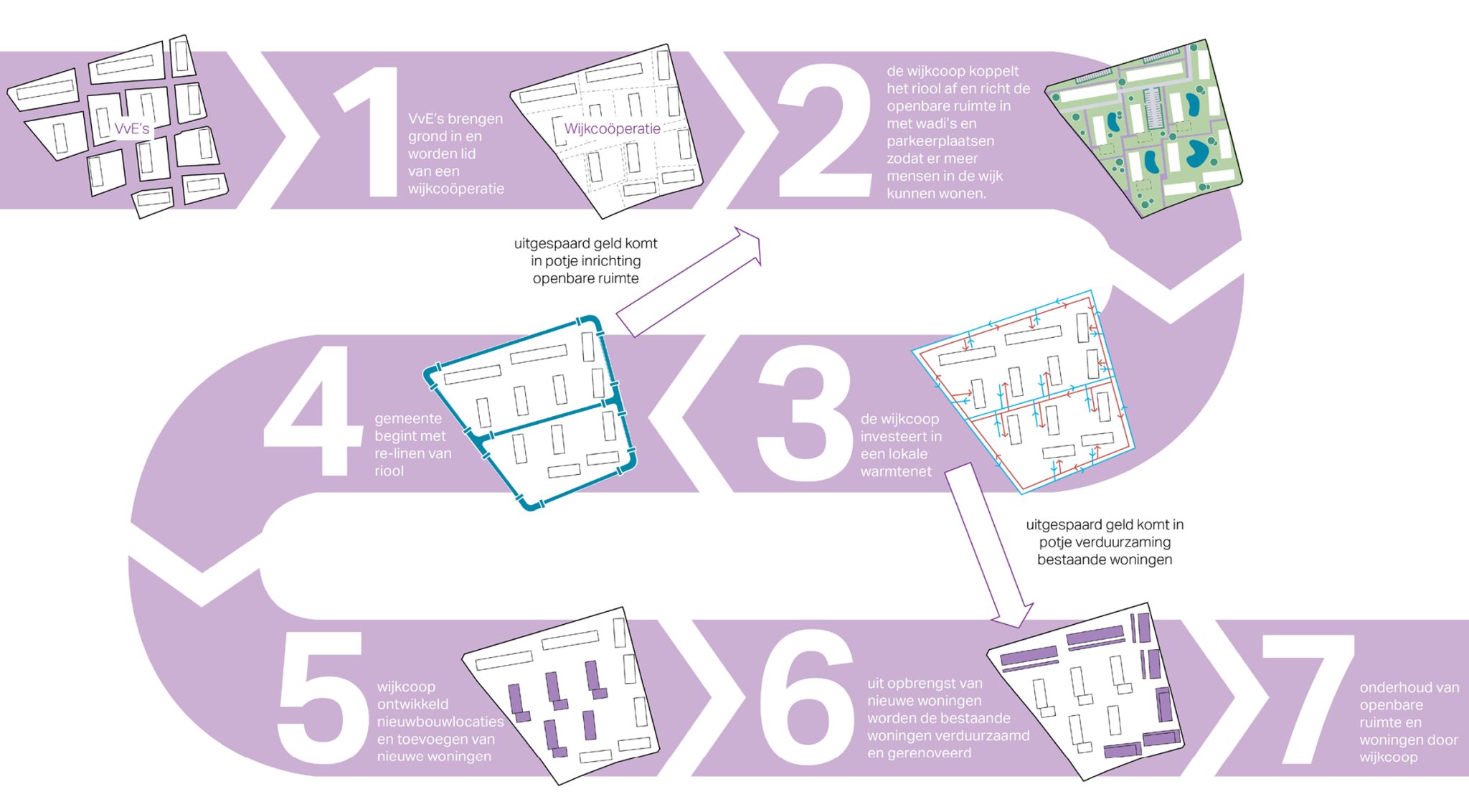 Onze integrale, wijkgerichte aanpak voor Dieze richt zich op watermanagement en een warmtenet, met actieve betrokkenheid van bewoners. De eerste stap is het oprichten van een wijkcoöperatie, waarin alle VvE’s deelnemen. Deze coöperatie fungeert als warmteschap en beheerder, en ontwikkelt een Programma van Eisen (PvE) op basis van wensen van bewoners en de gemeente. Samen met de gemeente wordt de financiering voor rioolvervanging geregeld. Door riool re-lining, wat goedkoper is, kunnen we het bespaarde geld inzetten voor herinrichting van de openbare ruimte. Daarnaast ontwikkelt de coöperatie een gefaseerd renovatie- en nieuwbouwprogramma, waarbij opbrengsten van nieuwbouw worden gebruikt voor verduurzaming van bestaande woningen. Onze aanpak kan de leefomgeving van 49.000 huishoudens verbeteren en 24.000 woningen toevoegen in de RES-regio Rotterdam/Den Haag. Met 184 kansrijke buurten in Nederland is onze missie om deze methode verder te ontwikkelen en kwetsbare wijken betaalbaar en haalbaar te transformeren.