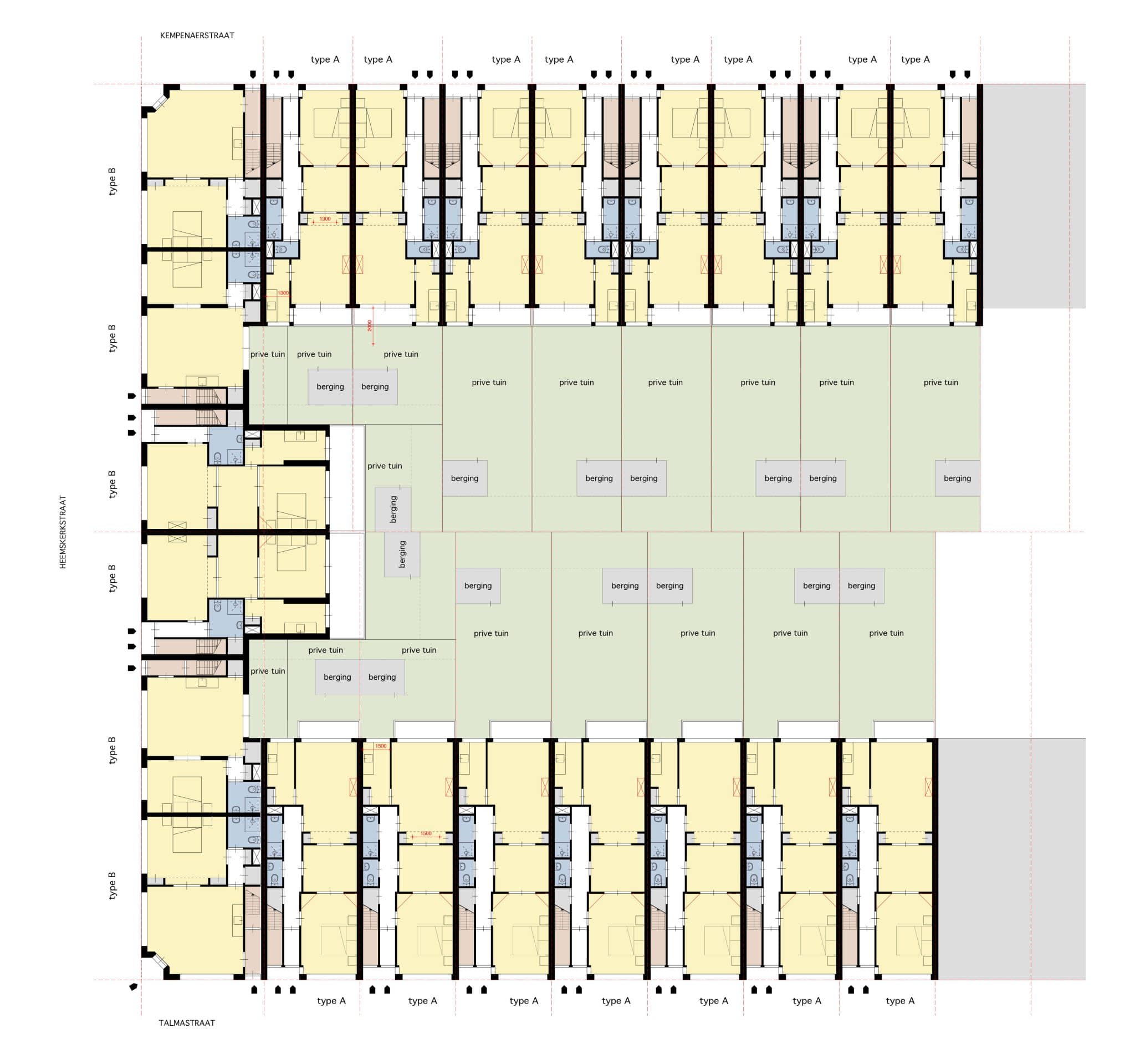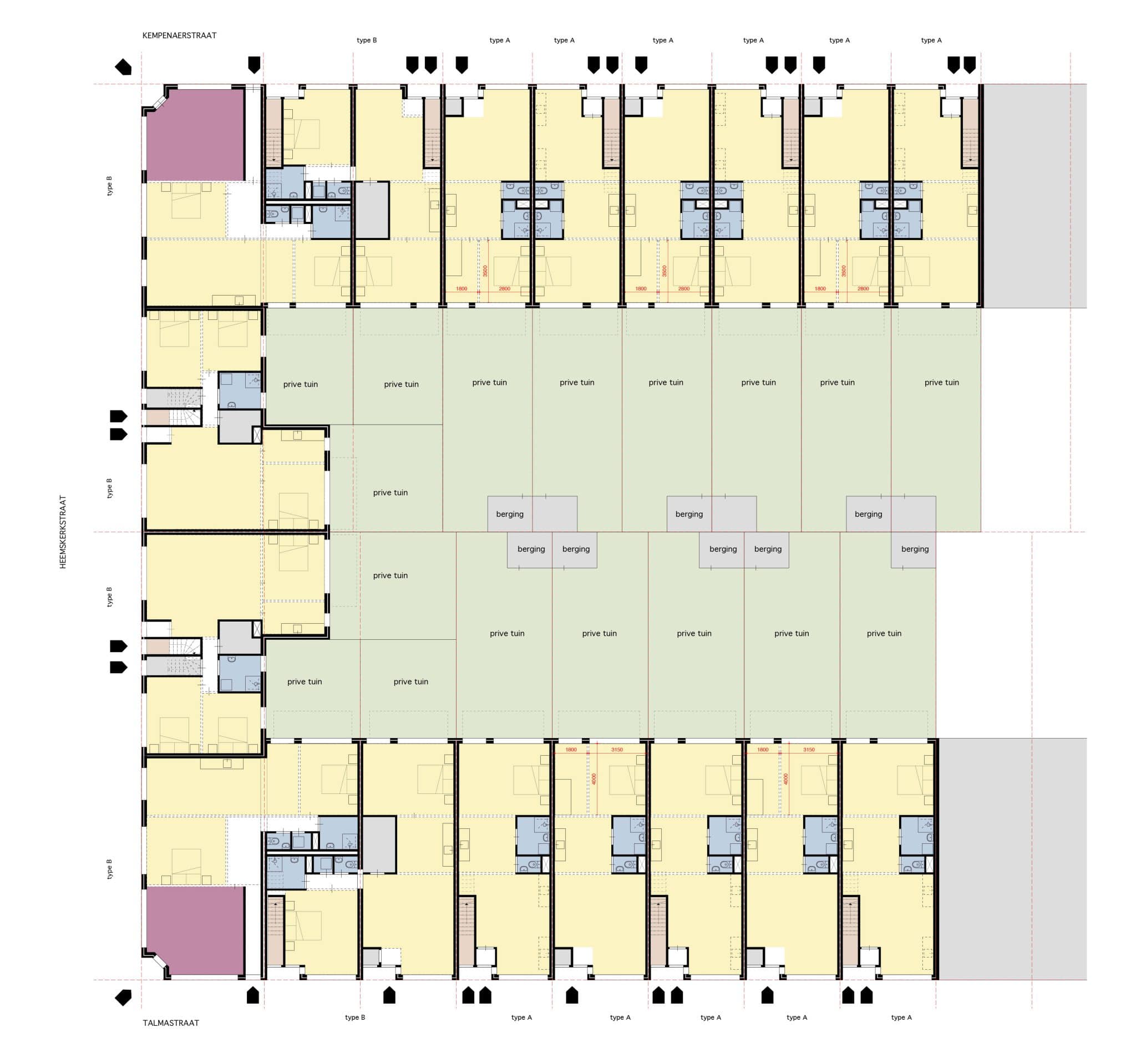 Hier zijn de trappenhuizen tussen twee panden gecombineerd in een portiek. Zo creëren we minder verkeersruimte en meer oppervlakte in de woningen. Verder kunnen de bovenste verdiepingen op twee manieren ingedeeld worden: drie 3-kamer gelijkvloerse woningen of twee 4-kamer maisonettewoningen, gesplitst in het tussenverdieping. Alle woningtypes krijgen een inpandige berging en grotere badkamers die voldoen aan het bouwbesluit. De keukens zijn in het midden van de woningen geplaatst om gecombineerd te worden met de voor- of achterkamer.