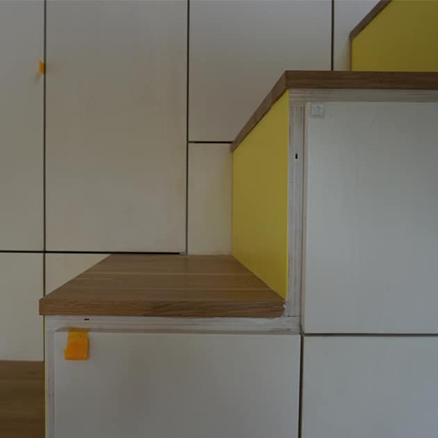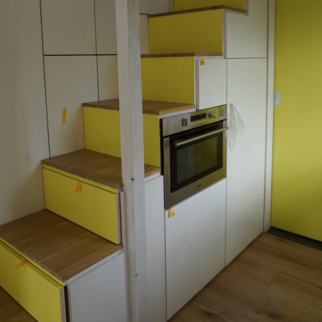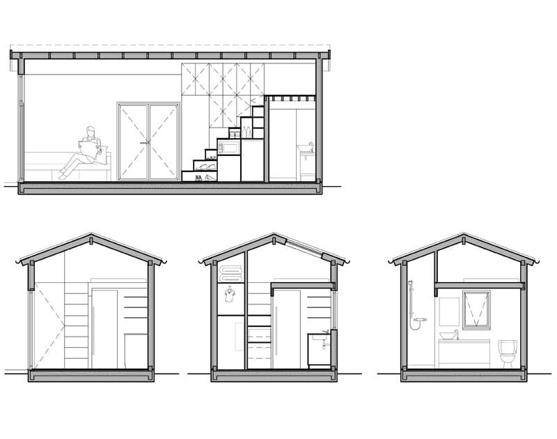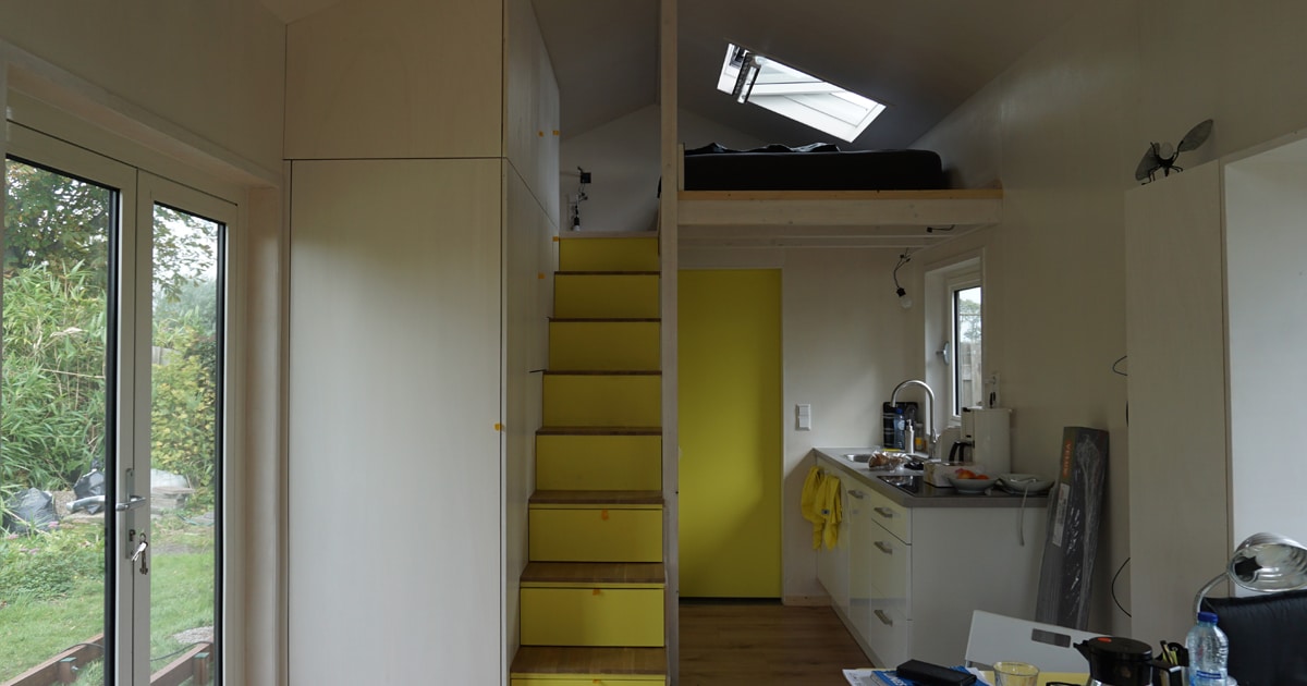 Een schrijver uit Amsterdam wilde een tiny house creëren als retreat in een prachtig polderlandschap buiten de stad. Het 21 m2 huisje voldoet aan alle normen en dagelijkse behoeften en heeft een sterke relatie met het omliggende buitengebied. Elk element is functioneel: de trap bevat de keukenapparatuur en opslagruimte, de erker is diep genoeg voor een zitplek, de kastenwand heeft een technische ruimte voor installaties die van buitenaf bereikbaar zijn, de douche heeft wat extra hoogte. Elk detail is samen met de klant ontworpen en doordacht om zowel voor flexibiliteit als optimalisatie van zo’n kleine ruimte te zorgen. En natuurlijk, het is volledig elektrisch!